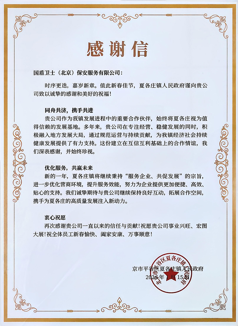 2026年1月21日上午,北京市平谷区夏各庄镇党委副书记、镇长沈浩彬、副镇长孟丹、税务所所长张静涛、市场所所长张学彬等相关部门一行领导莅临国盾卫士(北京)保安服务有限公司调研指导工作,并在会议室进行了亲切的座谈交流并颁发感谢信。公司执行董事邢利彬、勤务运营部总监马杰、人事部总监邢艳芹、办公室主任许云松陪同调研指导。
